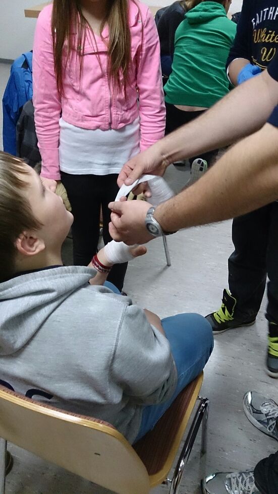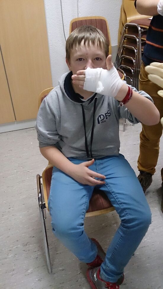 Verletzte Person mit Fußbruch. Hierbei hatten unsere Jugendlichen die Aufgabe, das vorher gehörte ins Praktische umzusetzen, was ihnen sehr gut gelang. Carsten erklärte uns anhand von praktischen Übungen, wie man sich um eine verletze Person kümmert. Des Weiteren durften unsere Jugendlichen eigene „Verletzungen“ verbinden. Wir teilten uns in Gruppen auf und verbanden die vorgegeben Verletzungen, welche danach von Carsten beurteilt und mit Tipps versehen wurden.