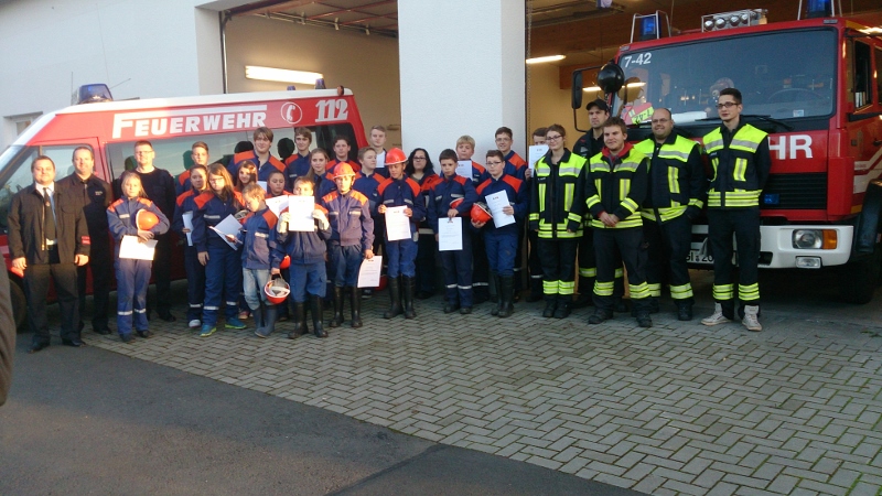 Aus den vier Licher Stadtteilen Birklar, Eberstadt, Nieder-Bessingen und Ober-Bessingen waren Jugendliche zusammengekommen, um Ihr Wissen zu Feuerwehrfahrzeugen und Löschwasser-Hydranten unter Beweis zu stellen. „Was sind die gängigsten Feuerwehrfahrzeuge, welche wasserführenden Armaturen gehören zu Standardausrüstung und was bedeuten die Zahlen auf Hydrantenschildern?" Diese Fragen und noch einige mehr stellte der Stadtjugendfeuerwehrwart. Nach korrekter Beantwortung war man sich einig, dass sich die Jugendlichen die Auszeichnung mit der Jugendflamme 1 ordentlich verdient hatten.